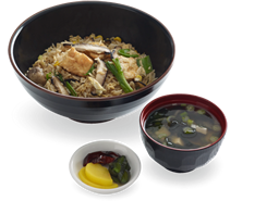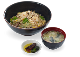 stir-fried rice with chicken and prawns, egg, magetout, mushrooms, sweetcorn and spring onions. Served with a side portion of miso soup and pickles