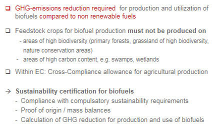 EC: Renewable Energy Directive (RED) biofuels from existing installations –> ≥ 35 % until end of 2017 –> ≥ 50% from Jan. 2018