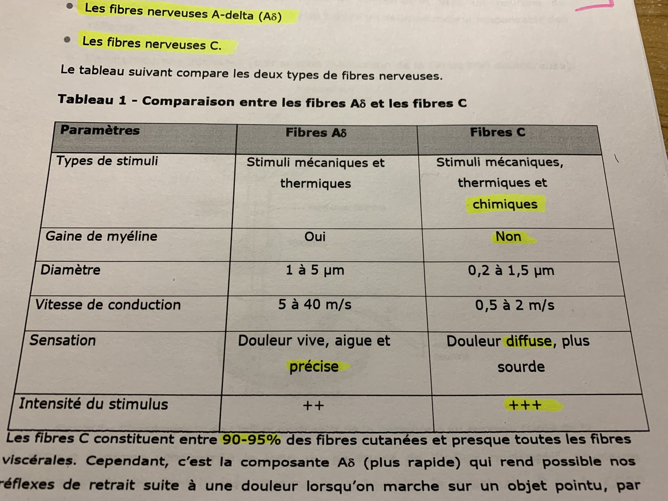 Les fibres C à genre 90-95 % des fribres cutanés et l’entièreté des fibres viscérales … non myélinisés… captent aussi les stimuli chimique, douleur diffuse plus sourde…. intensité du stimulus plus intense…