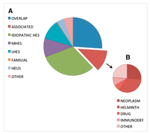 Em 2005 um consenso para tratamento de HES propos um esquema de classificação que subdividia esses pacientes de acordo com caracteristicas clínicas. Essa classificação foi refinada em 2010 e divide os pacientes em 6 variantes clínicas