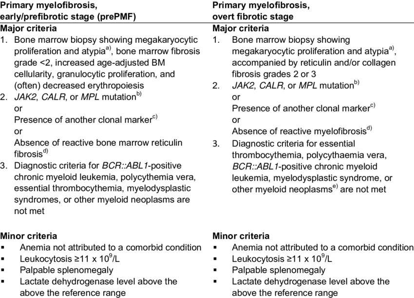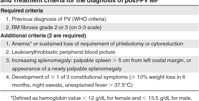 Os valores de corte foram atualizados na ultima classificação em 2016. Nos critérios anteriores de 2008 os pontos de corte eram maiores e tinham menos sensibilidade ao diagnóstico. Estudos mostravam que muitos pacientes com TE JAK2 positiva com trombocitose e Ht mais baixos eram reclassificados como PV quando realizados estudos de MO ou massa eritrocitária.