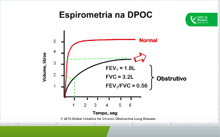 Diagnóstico: Presença de VEF / CVF < 0,70% após broncodilatador confirma DPOC