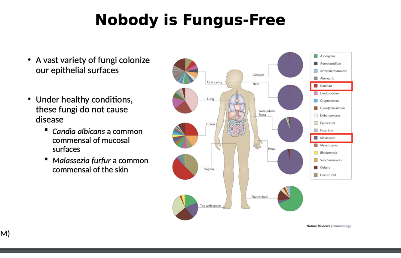 What are two commensal fungi found on our epithelial surface? Where are they found?
