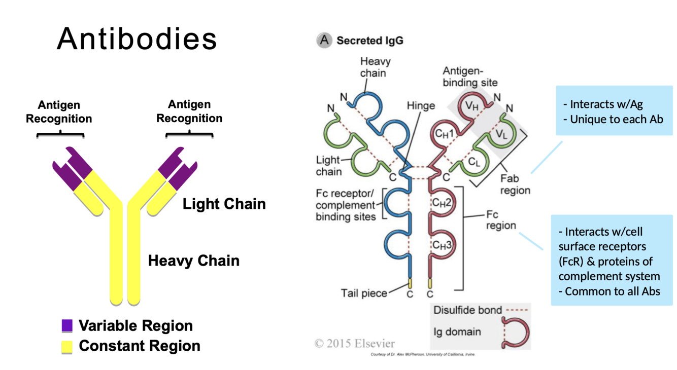 Each antibody is unique bc it has a unique antigen recognition region which is variable, called Fab region.