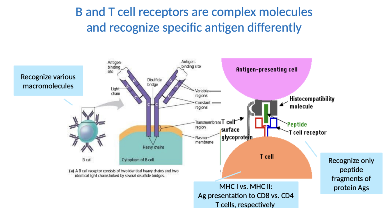 B and T cell receptors are complex molecules and recognize specific antigen differently. How do they recognize them?