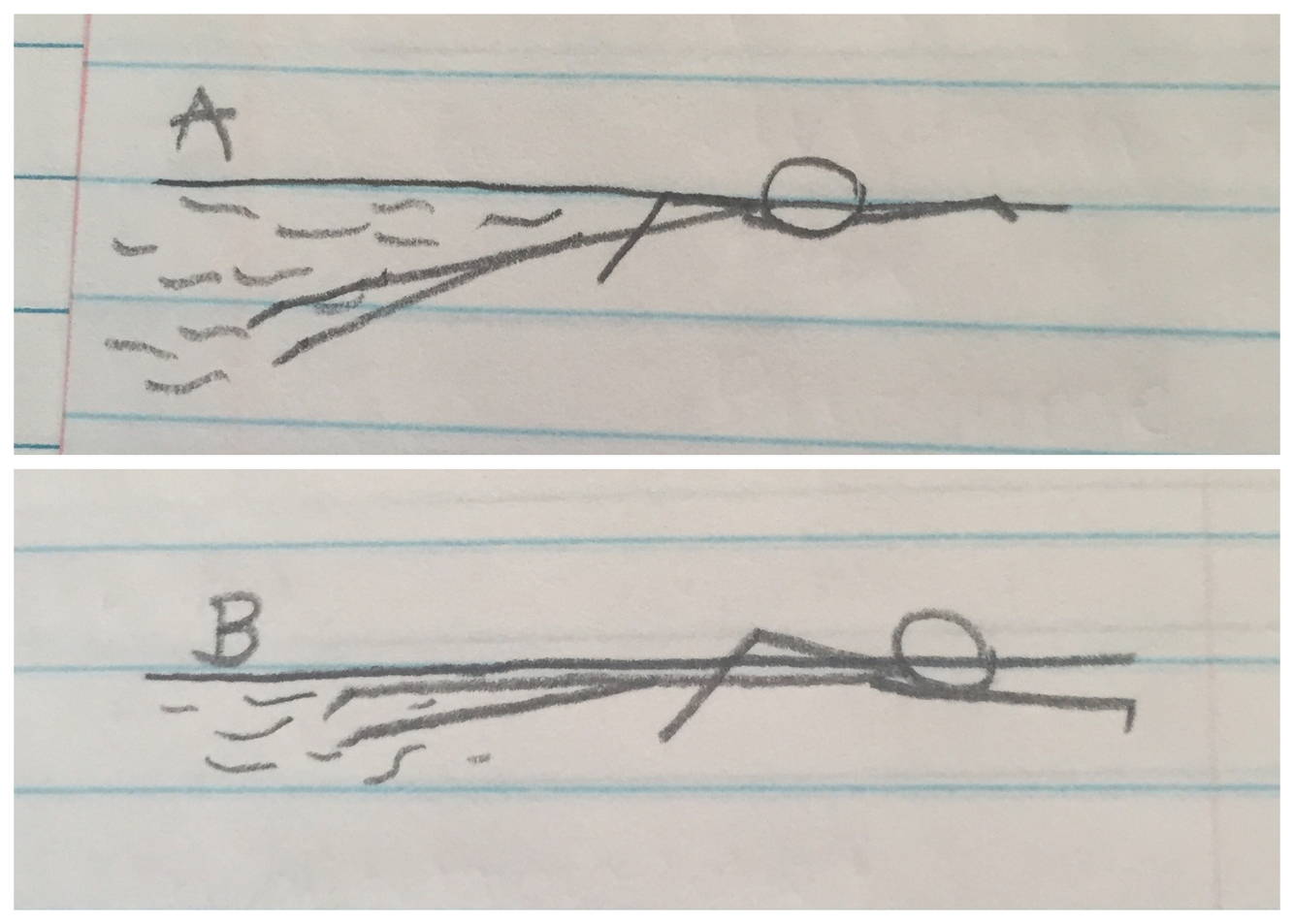 A. swimmer hanging down in the water has a larger drag force. B. swimmer lying flatter in the water has a lesser drag force.