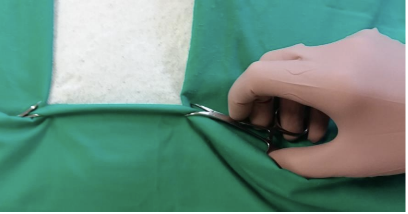Place towel clips diagonally with a SMALL piece of skin in the jaws and close the ratchet
