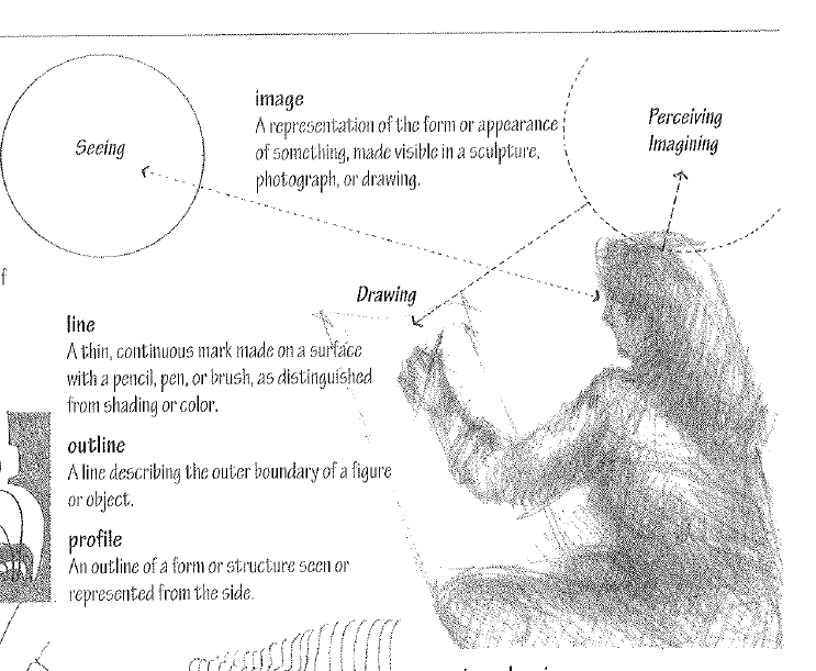 The art, process, or technique of representing an object, scene, or idea by means of lines on a surface.