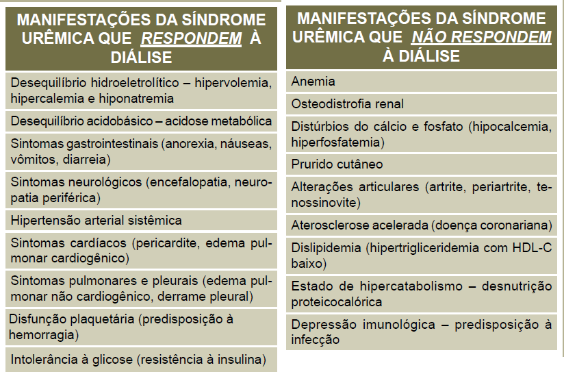 Tabelas manifestações da SU que respondem e que não respondem à diálise.