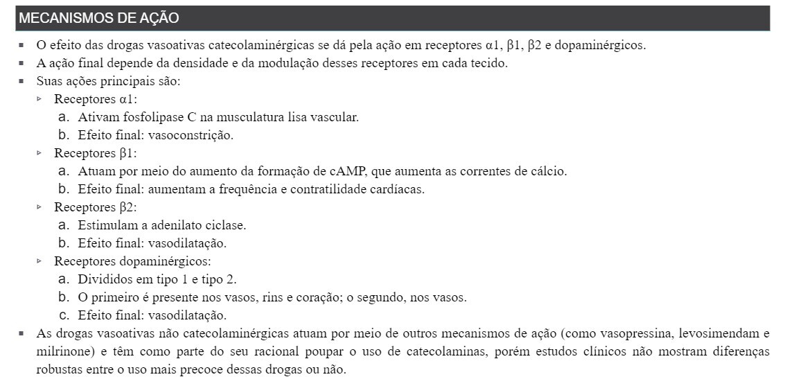 O efeito das drogas vasoativas catecolaminérgicas se dá pela ação em receptores α1, β1, β2 e dopaminérgicos.