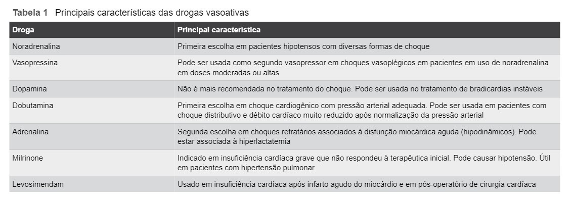 As principais características das drogas vasoativas estão descritas na Tabela 1 e um resumo de seus mecanismos de ação e efeitos hemodinâmicos na Tabela 2.