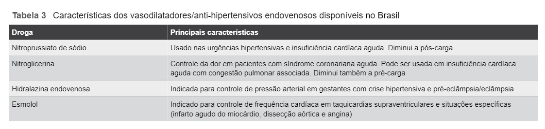 Em pacientes com outras emergências hipertensivas, recomendamos o uso de drogas que tenham efeito rápido e curta meia-vida para desmame do vasodilatador endovenoso, como captopril, propranolol, hidralazina ou clonidina.
