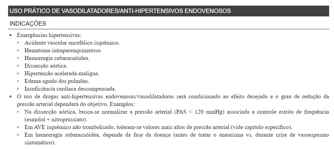 INDICAÇÕES USO PRÁTICO DE VASODILATADORES/ANTI-HIPERTENSIVOS ENDOVENOSOS