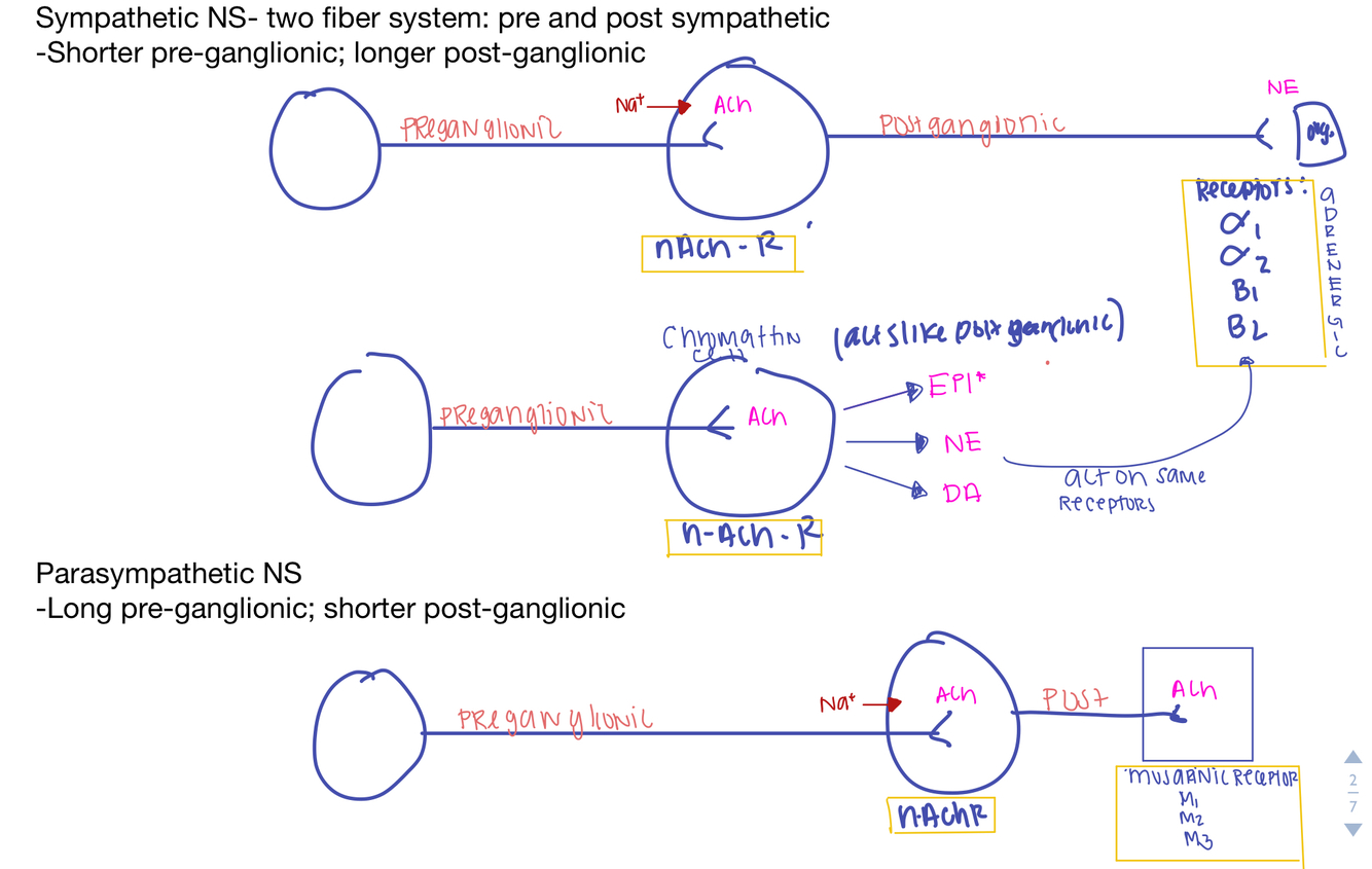 Post-ganglioni cells have swellings called varisosities along the axon that allow the release of NT.