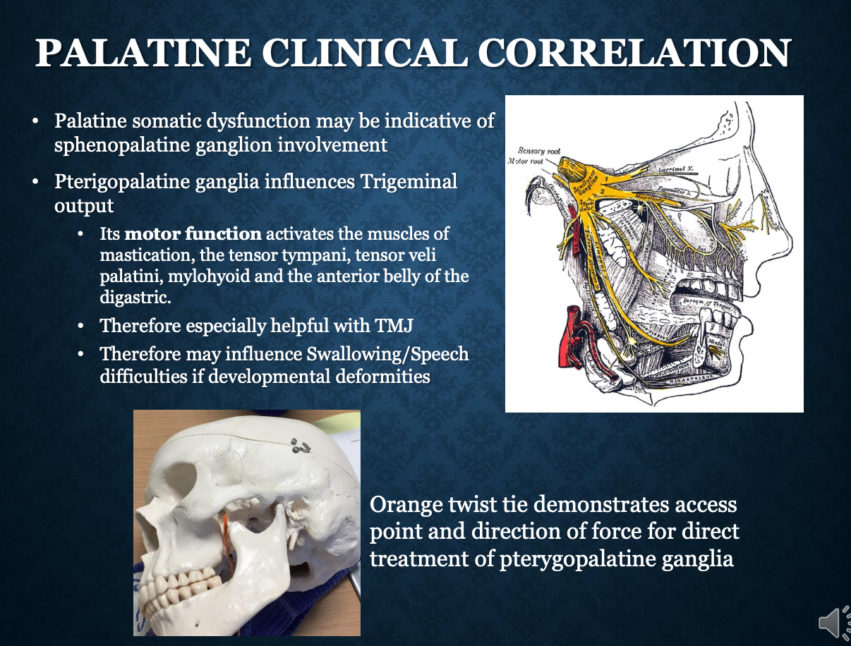 pteriogopalatine ganglia influences trigeminal output (TMJ, swallowing, speech)