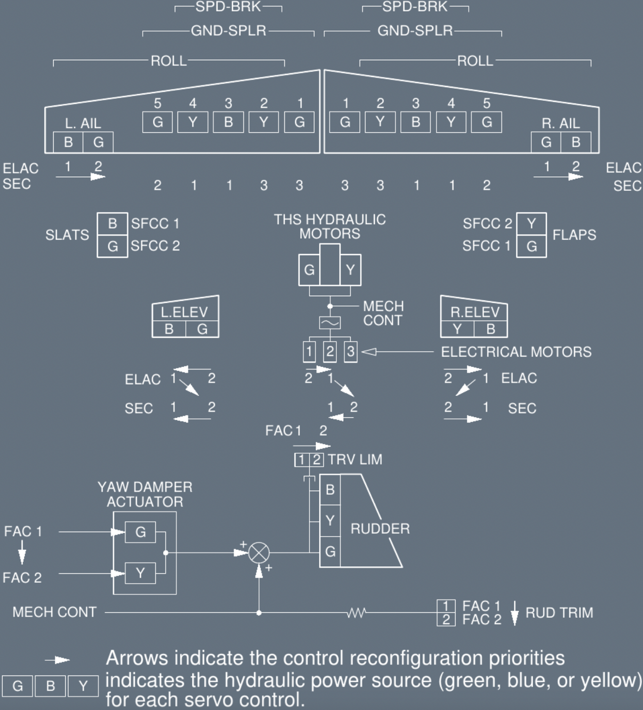 ex : Left primary is blue when controlled by ELAC 1, if controlled by ELAC 2 then HYD G.