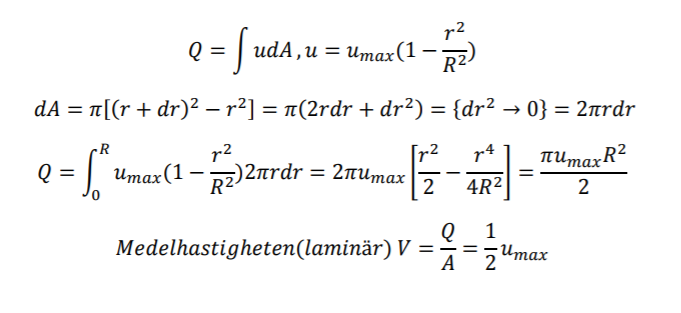 R 6. Hastighetsprofilen vid fullt utbildad laminär rörströmning kan skrivas som 𝑢 = 𝑢𝑚𝑎𝑥(1 − 𝑟 ^2/𝑅^2 ). Visa att medelhastigheten vid fullt utbildad rörströmning är lika med halva maxhastigheten.