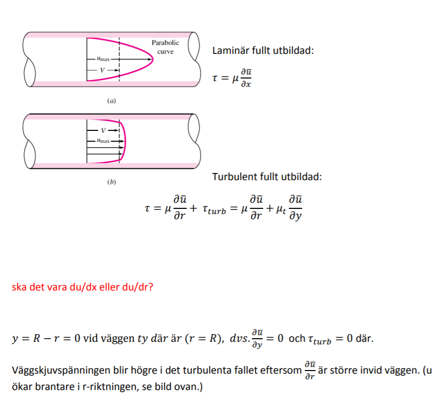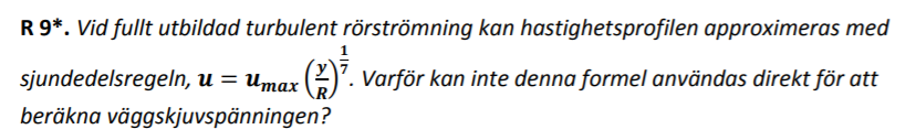 R 8*. Skissa en laminär och en turbulent hastighetsprofil vid fullt utbildad rörströmning. Vilken av profilerna ger högst väggskjuvspänning vid ett givet massflöde? Motivera