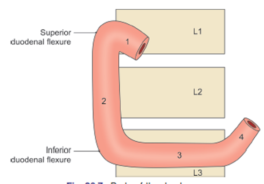 Begins at the superior duodenal flexure, passes downwards to reach the lower border of the third lumbar vertebra, where it curves towards the left at the inferior duodenal flexure, to become continuous with the third part