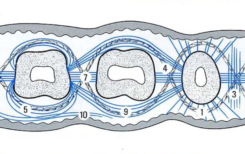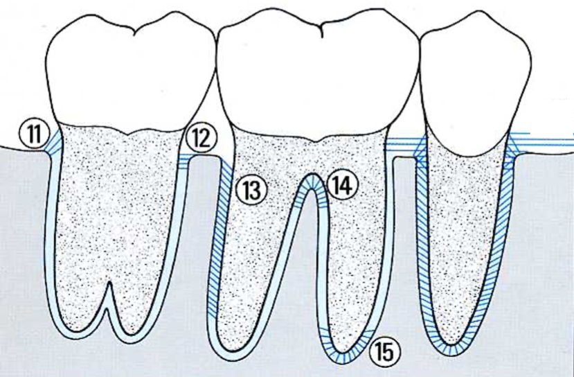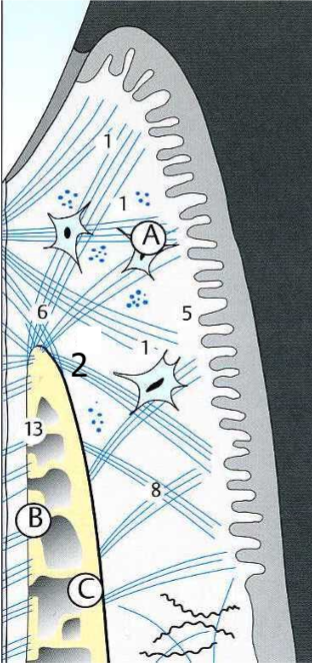 Fibre alvéolo-gingivale (s’attache au bout de l’os alvéolaire)