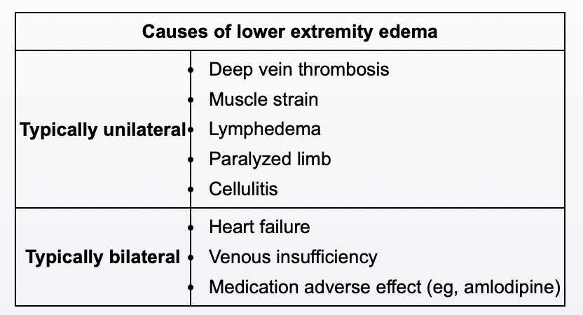 Acute asymmetric lower extremity edema (right > left) is concerning for deep vein thrombosis (DVT). DVT should be suspected in patients with acute unilateral edema, which may be accompanied by pain, warmth, erythema, or tenderness to palpation. Although these symptoms may be present, they are not specific. The presentation may be subtle. The most reliable and possibly the only finding of DVT is increased circumference of the affected leg due to localized edema, resulting from increased venous hydrostatic pressure distal to the thrombus and inflammatory disruption of vascular membrane integrity.