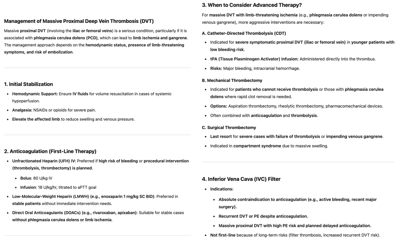 Massive proximal DVT (involving the iliac or femoral veins) is a serious condition, particularly if it is associated with phlegmasia cerulea dolens (PCD), which can lead to limb ischemia and gangrene. The management approach depends on the hemodynamic status, presence of limb-threatening symptoms, and risk of embolization. Anticoagulation (First-Line Therapy) is given, such as Direct Oral Anticoagulants (DOACs) (e.g., rivaroxaban, apixaban): Suitable for stable cases without phlegmasia cerulea dolens or limb ischemia. Low-Molecular-Weight Heparin (LMWH) (e.g., enoxaparin 1 mg/kg SC BID): Preferred in stable patients without immediate intervention needs. Unfractionated Heparin (UFH) IV: Preferred if high risk of bleeding or procedural intervention (thrombolysis, thrombectomy) is planned. Thrombolytics (tPA) or surgical thrombectomy if severe swelling or ischemia is present.