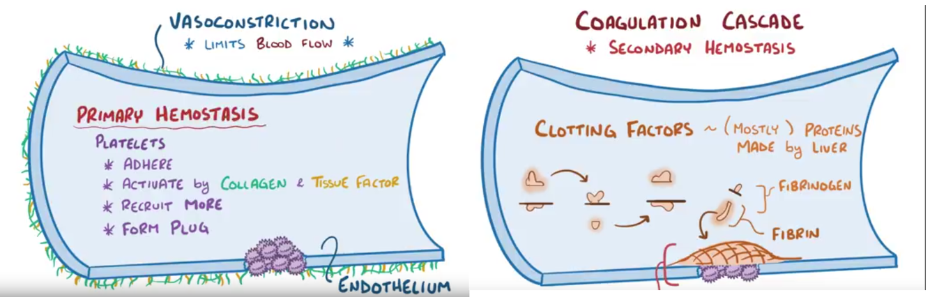 Starts with damage to the endothelium, which causes vasoconstriction and subsequent platelet activation (primary haemostasis) and of clotting factors (secondary haemostasis), which forms a fibrin plug