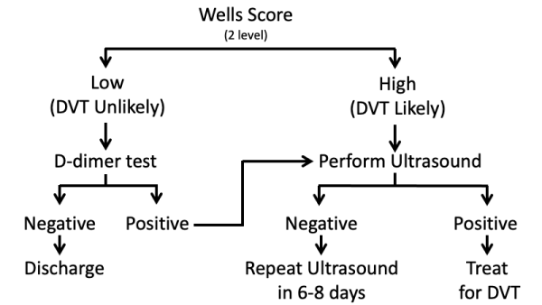 How does the DVT two-level wells score affect the management of the patient?