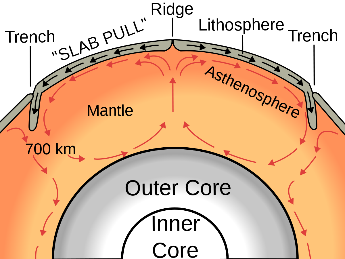 As the hot outer core heats up the mantle at the bottom, the hot mantle rises until it cools down and falls back down again
