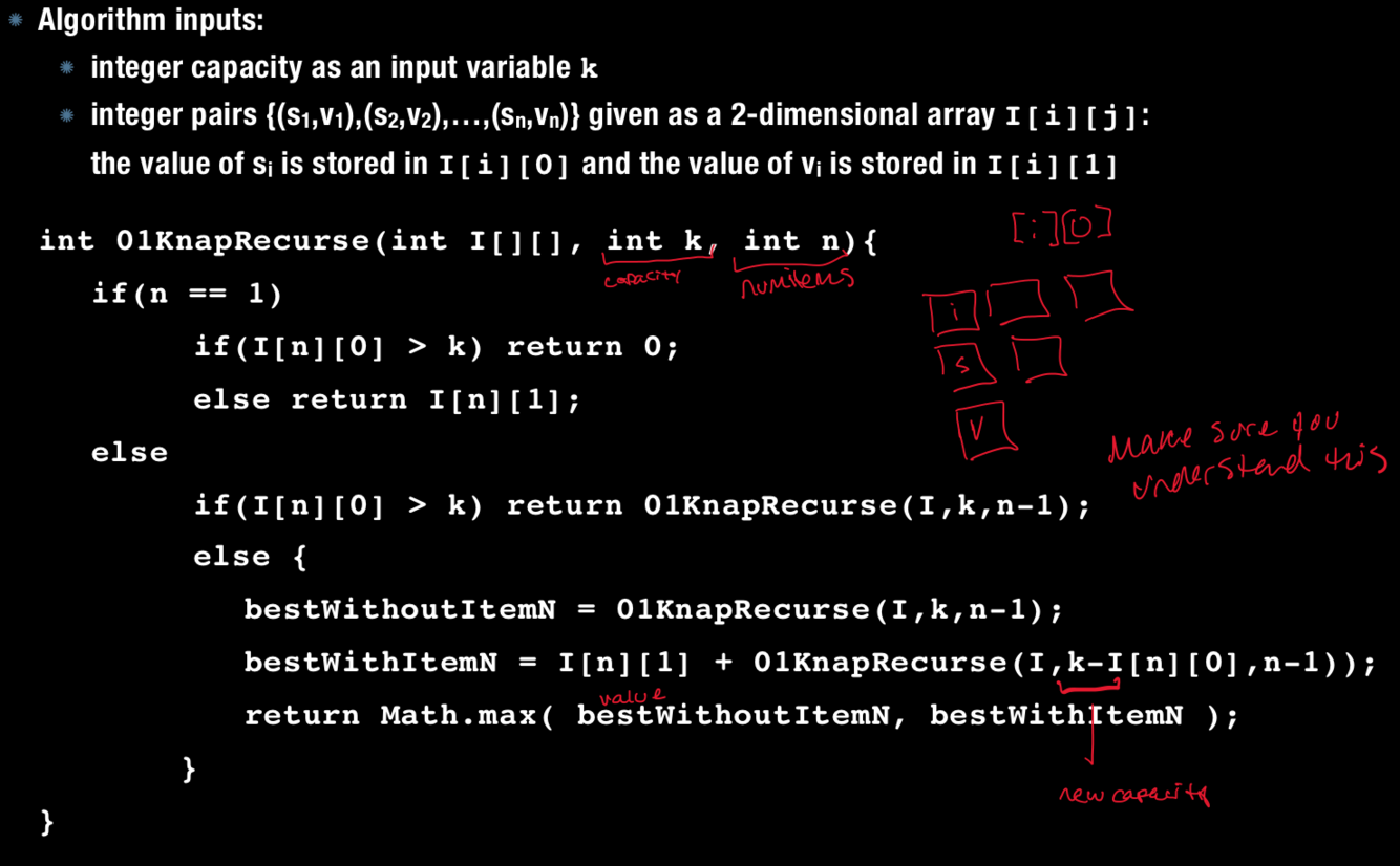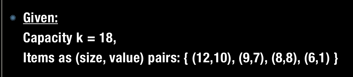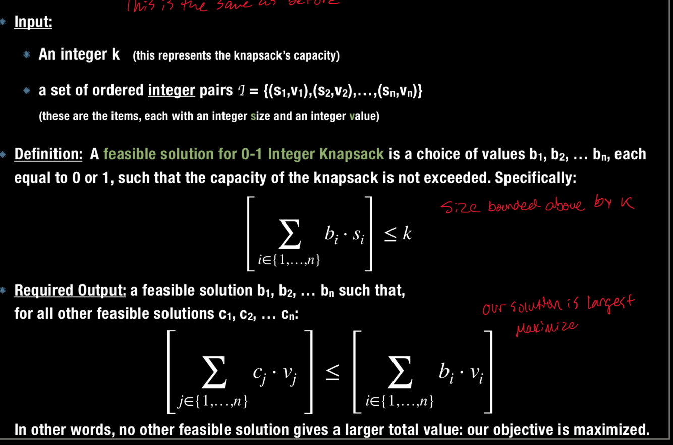 As a review, what is the input and definintion of the 0-1 knapsack problem?
