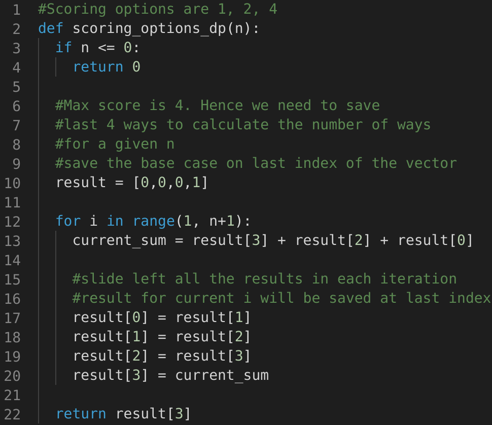 We’ll use the dynamic programming approach to build the solution bottom-up. We’ll store the results in a fixed size array. Scoring options are 1, 2, and 4. The maximum score is 4, so we need to save the last four ways to calculate the number of ways for a given ‘n’. On each iteration, the result will be the sum of values present at the 3rd, 2nd, and 0th index of the results array. This is because the result at ‘n’ is the sum of values at n-1, n-2 and n-4. We’ll slide the results towards the left and save the current result at the last index.