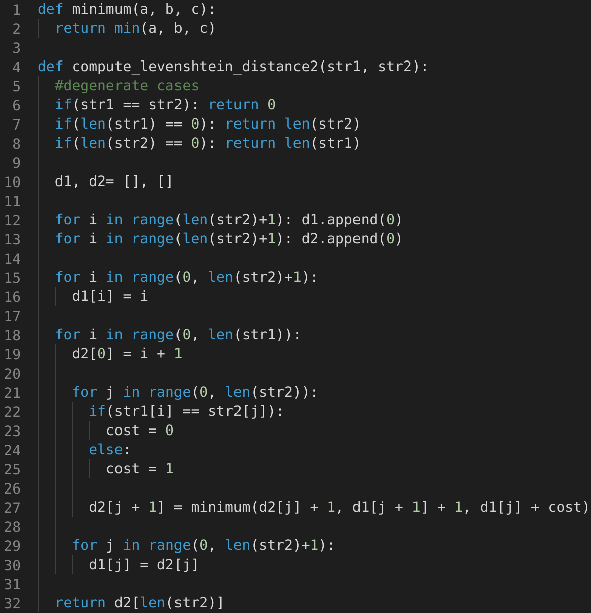 d2[j+1] = minimum( d2[j] +1, d1[j+1] + 1, d1[j] + cost )