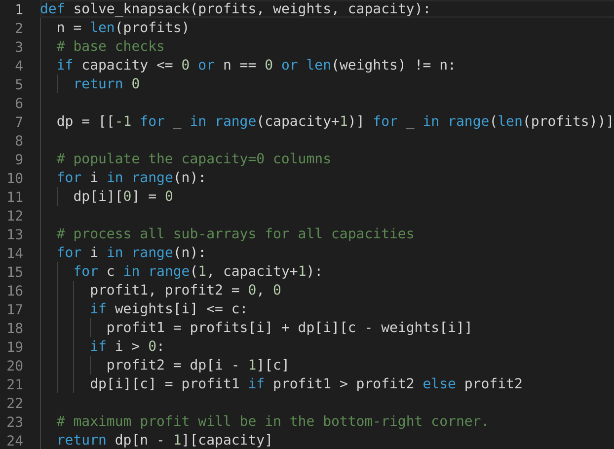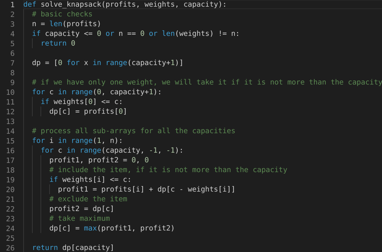 i. In this case, we will take whatever profit we get from the sub-array excluding this item => dp[i-1][c]i; if its weight is not more than the capacity. In this case, we include its profit plus whatever profit we get from the remaining capacity and from remaining items => profit[i] + dp[i-1][c-weight[i]]Finally, our optimal solution will be maximum of the above two values:
