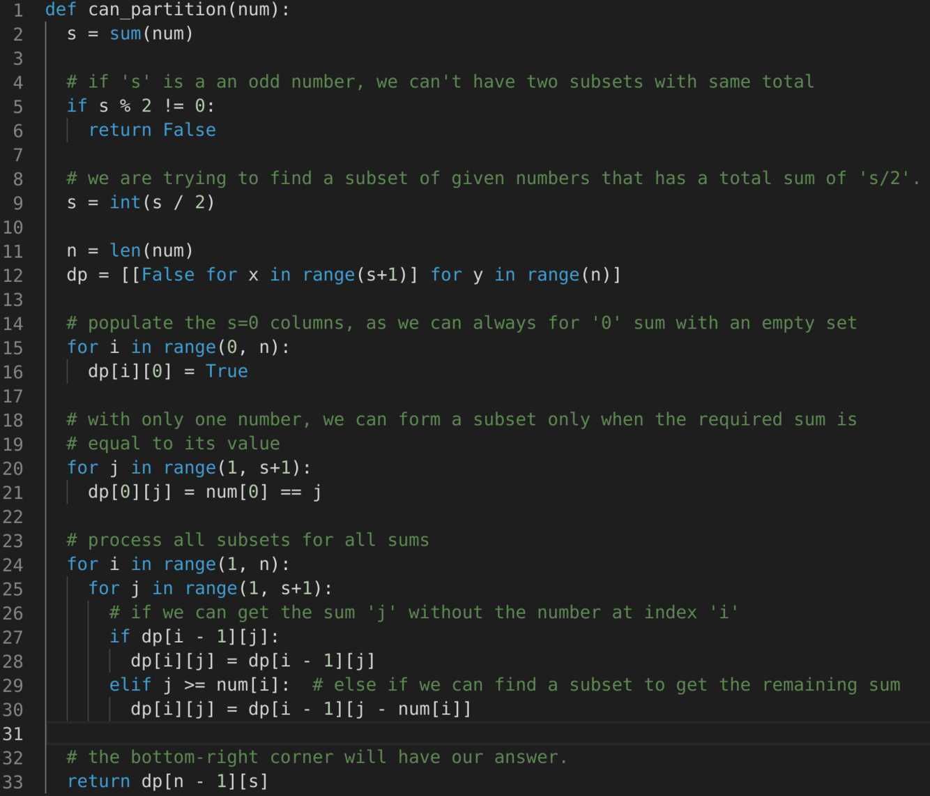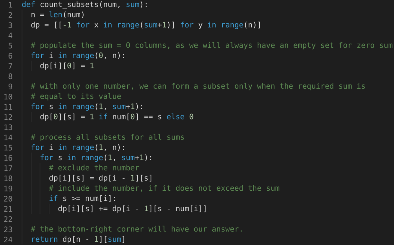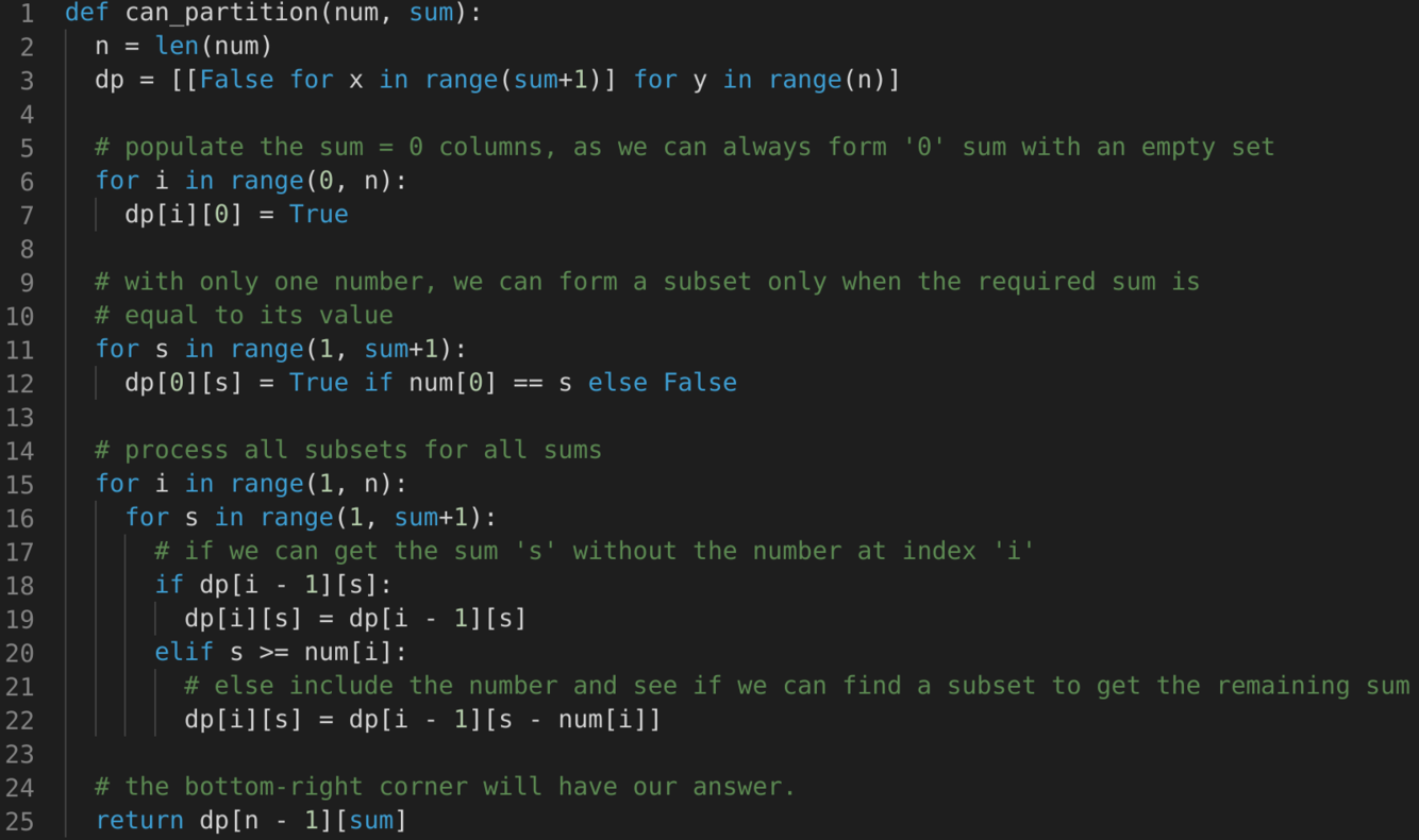 dp[i-1][s]dp[i-1][s-num[i]]If either of the two above scenarios is true, we can find a subset of numbers with a sum equal to ‘s’.