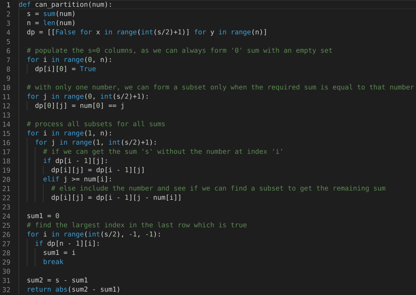 Let’s assume ‘S’ represents the total sum of all the numbers. So what we are trying to achieve in this problem is to find a subset whose sum is as close to ‘S/2’ as possible, because if we can partition the given set into two subsets of an equal sum, we get the minimum difference i.e. zero. This transforms our problem to Subset Sum, where we try to find a subset whose sum is equal to a given number– ‘S/2’ in our case. If we can’t find such a subset, then we will take the subset which has the sum closest to ‘S/2’. This is easily possible, as we will be calculating all possible sums with every subset.