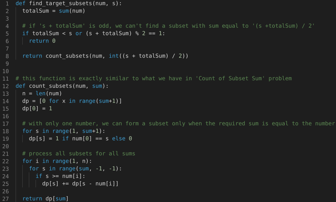 We’ll try to find if we can make all possible sums with every subset to populate the array dp[TotalNumbers][S+1].