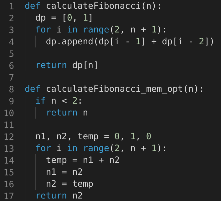 We don’t need to store all the previous numbers up to ‘n’, as we only need two previous numbers to calculate the next number in the sequence. Let’s use this fact to further improve our solution.