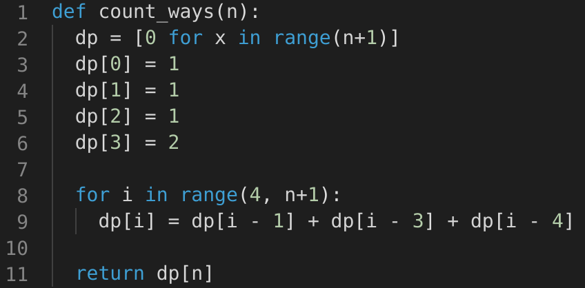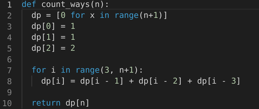 We can optimize the space used in our previous solution. We don’t need to store all the counts up to ‘n’, as we only need three previous numbers to calculate the next count.