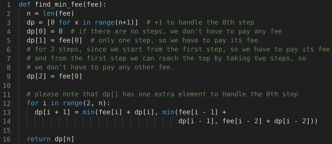 Let’s try to populate our dp[] array from the above solution, working in a bottom-up fashion. As we saw in the above code, every findMinFeeRecursive(n) is the minimum of the three recursive calls; we can use this fact to populate our array.