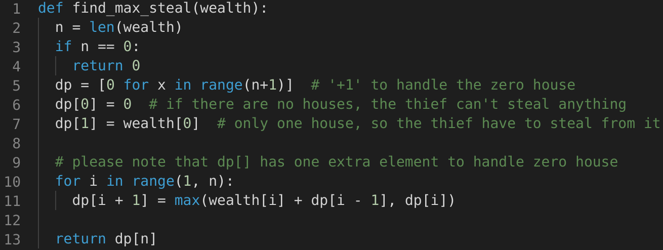 Let’s try to populate our dp[] array from the above solution, working in a bottom-up fashion. As we saw in the above code, every findMaxStealRecursive() is the maximum of the two recursive calls; we can use this fact to populate our array.