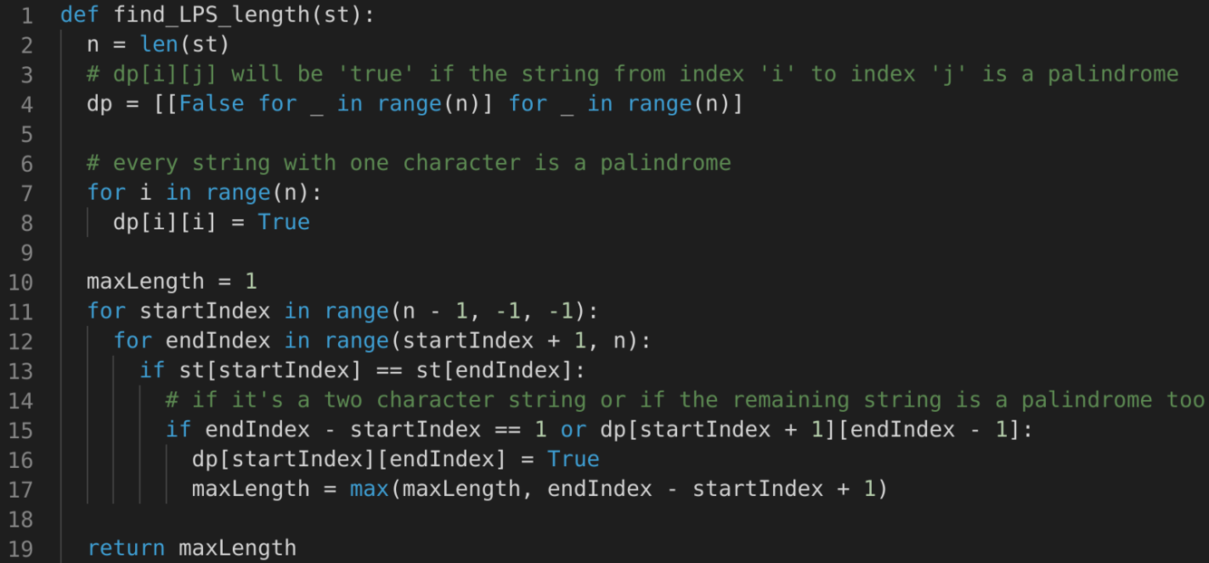 Since we want to try all the subsequences of the given sequence, we can use a two-dimensional array to store our results. We can start from the beginning of the sequence and keep adding one element at a time. At every step, we will try all of its subsequences. So for every startIndex and endIndex in the given string, we will choose one of the following two options: