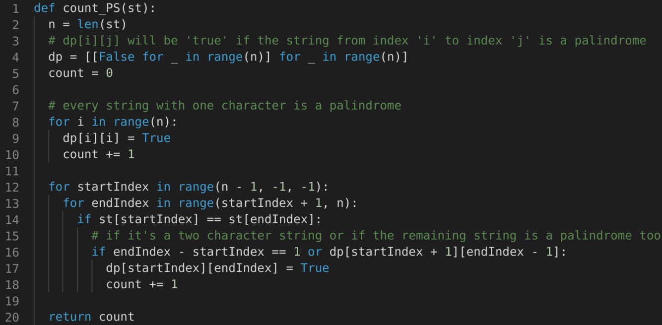 This problem follows the Longest Palindromic Subsequence pattern, and can be easily converted to Longest Palindromic Substring. The only difference is that instead of calculating the longest palindromic substring, we will instead count all the palindromic substrings.