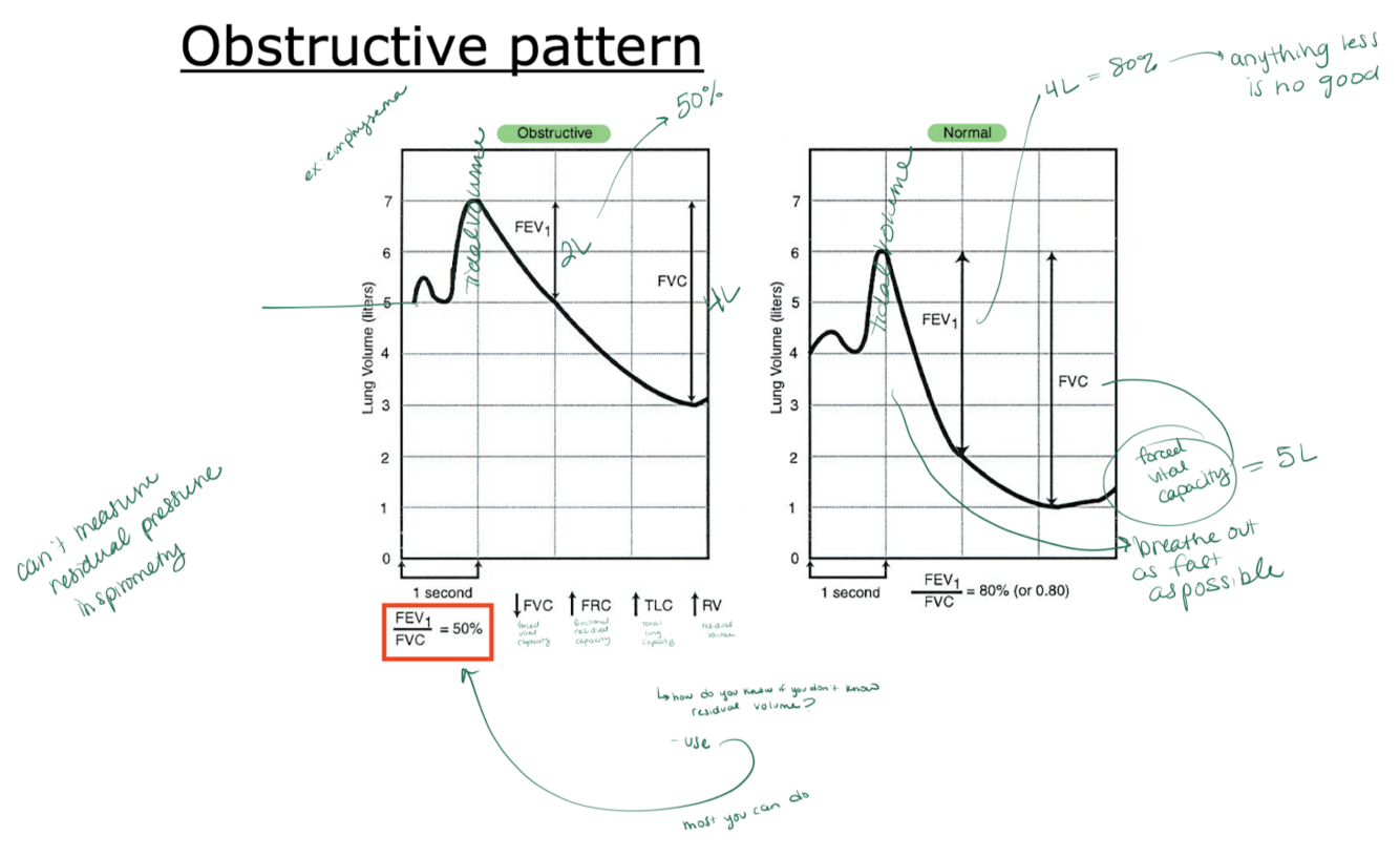 - FEV1/FVC = 0.5 = BAD – indicative of obstructive pattern