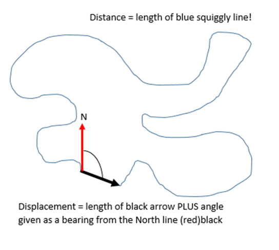 Distance is the length of the path you actually take and it is a scalar, displacement is the straight line distance between where you started and finished including a direction as it is a vector.
