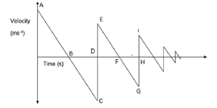 A ball is thrown upwards into the air and is allowed to fall and bounce. See graph. Between which points on the graph is the ball hitting the ground?