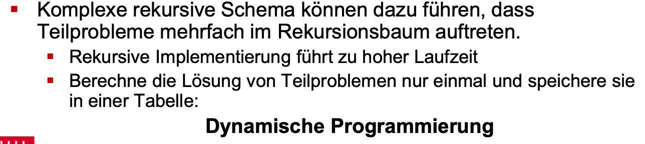 Überlappende Teilprobleme: Es gibt eine (polynomielle) Anzahl von Teilproblemen, deren Lösungen immer wieder zur Lösung größerer Teilprobleme herangezogen werden.
