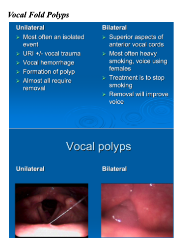bilateral vocal polyps: usually seen in females. smoking+vocal abuse –> progressive lowering of vocal pitch.