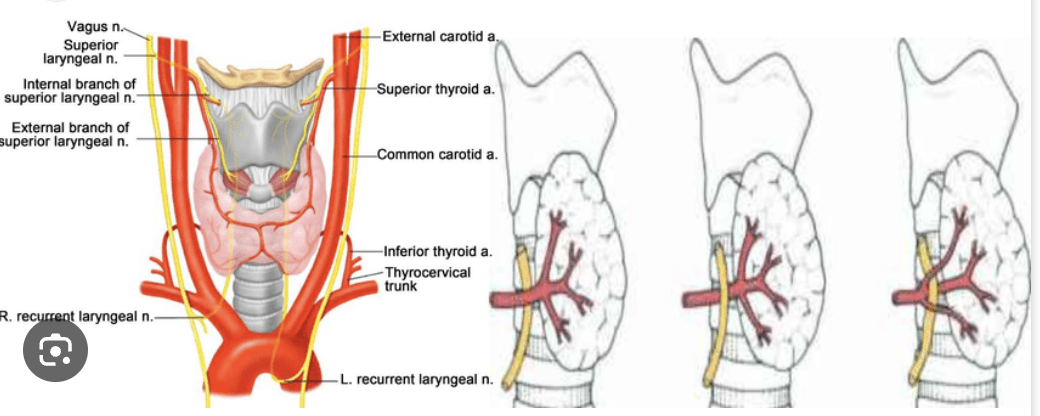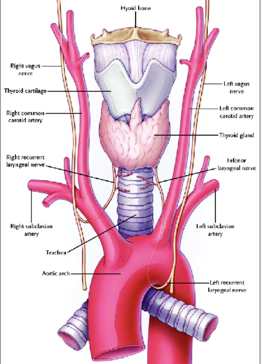 Recurrent laryngeal nerve innervates vocal cords and can be damaged in thyroid surgery