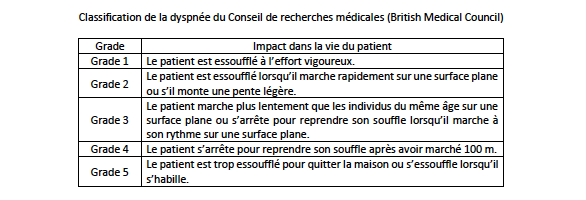IN1-123 Grader la dyspnée selon la classification fonctionnelle de la New York Heart Association et selon la classification du Conseil de recherches médicales (ou British Medical Council).