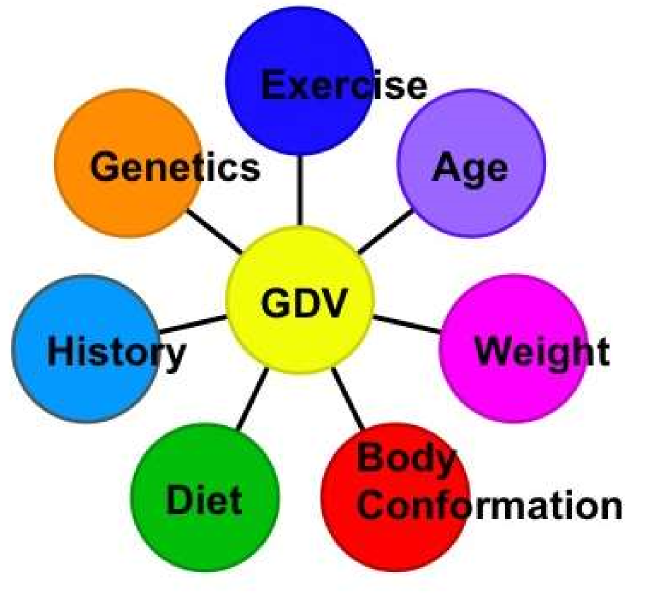 distension of the stomach with fluid, food, and or gas (pressure on caudal vena cava if distension is huge)